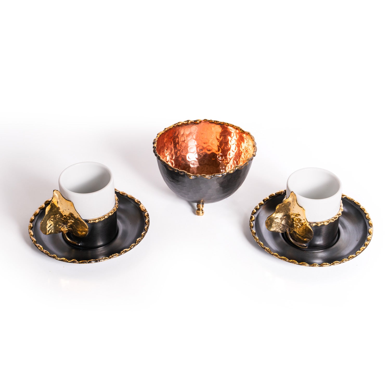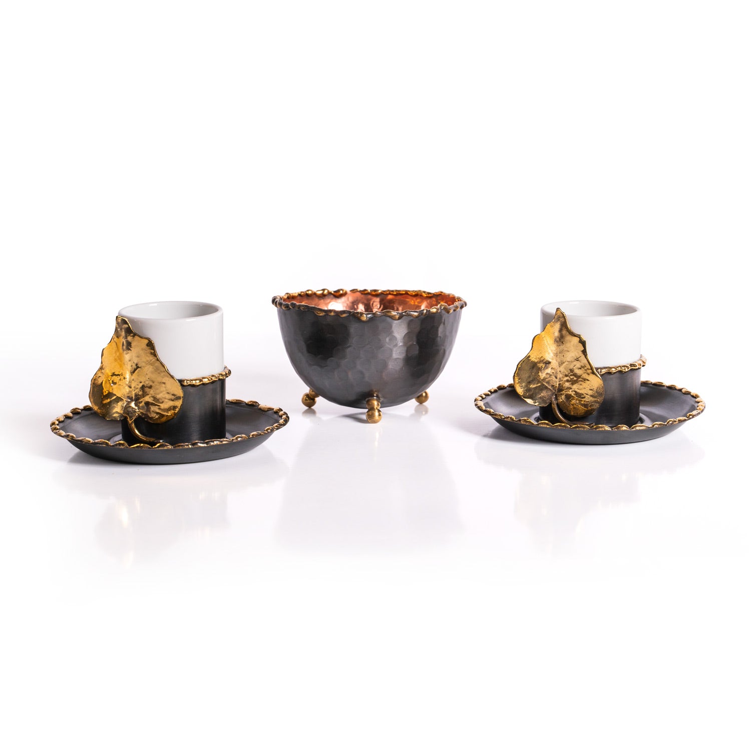 Lux Bakır Kahve Seti: 2 Adet Yaprak Motifli Fincan ve Siyah-Bakır Çerezlik