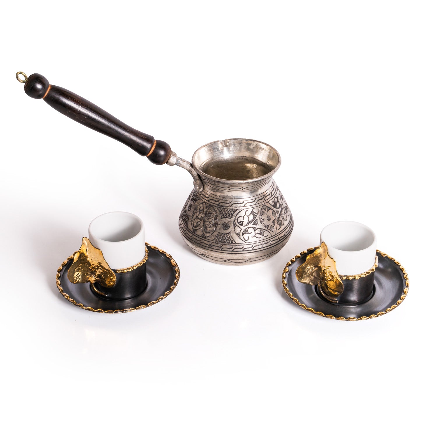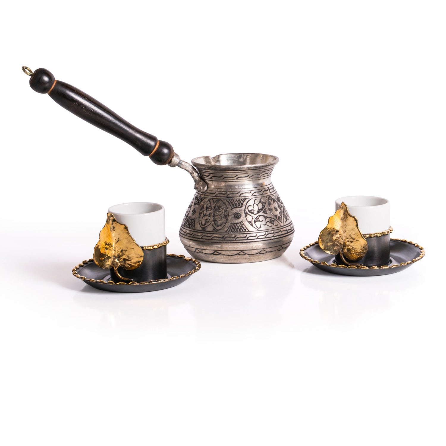 Bakır Kahve Seti - 2 Adet Yaprak Motifli Fincan ve 2 Kişilik Cezve El Yapımı