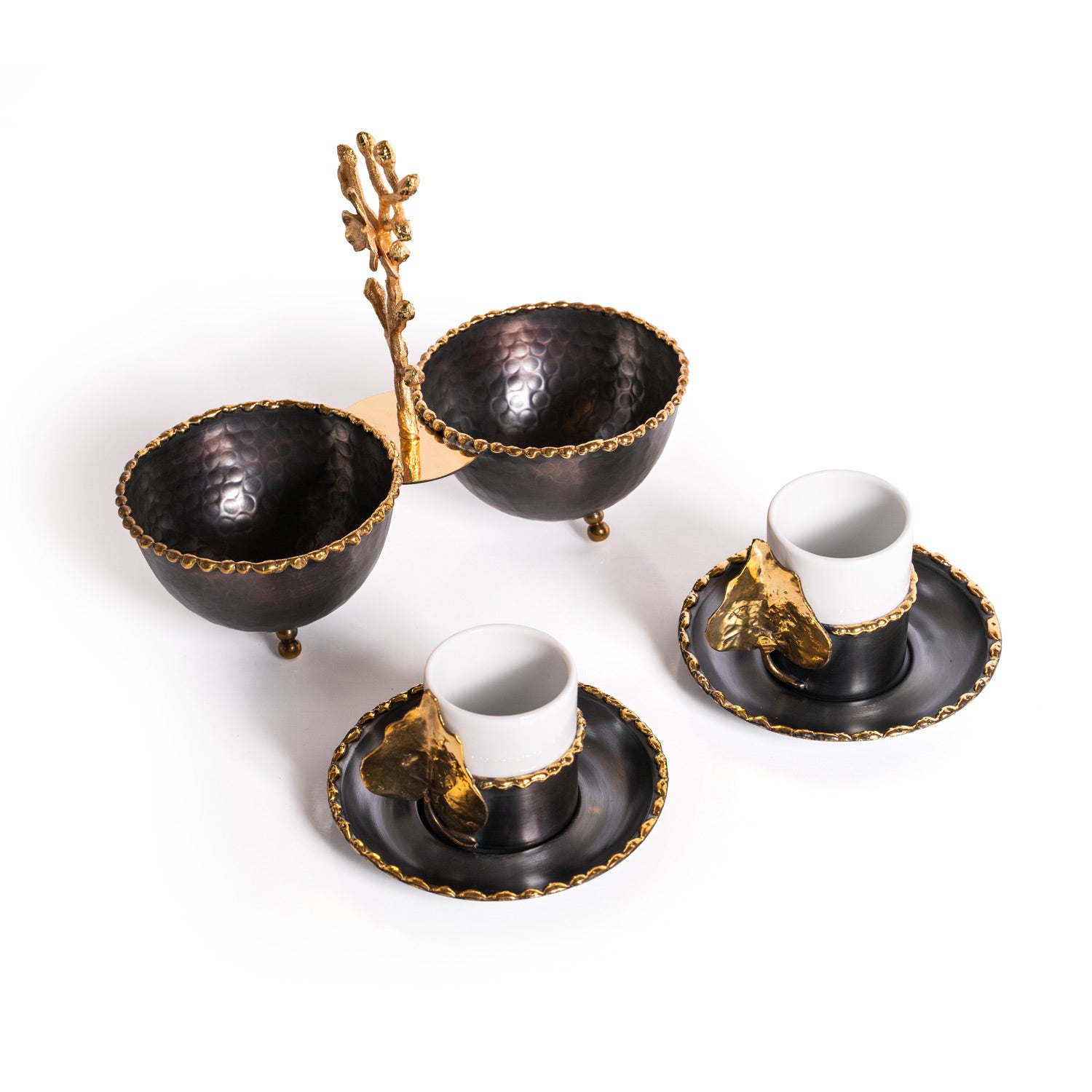 Lux Bakır Kahve Seti: Yaprak Motifli Fincan ve İkili Çerezlik