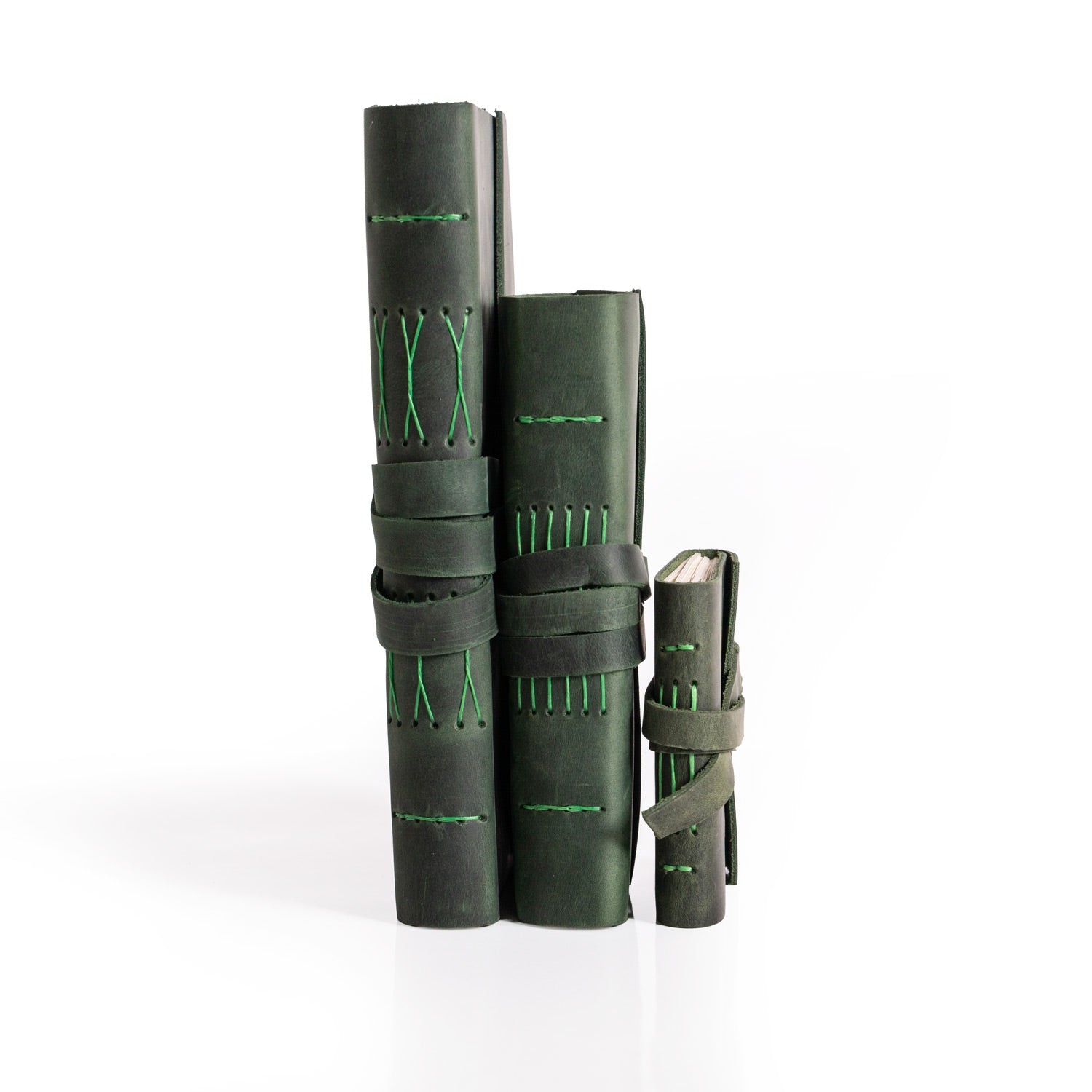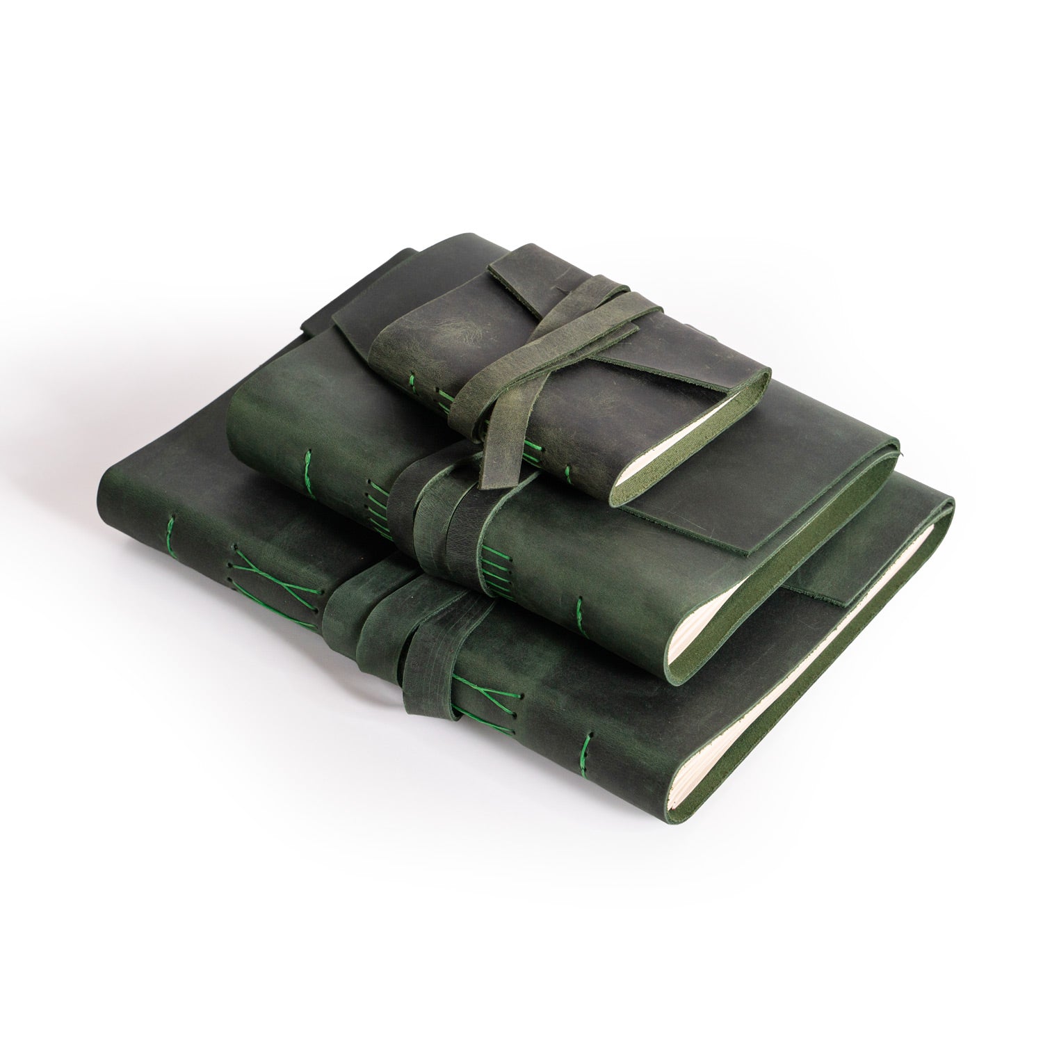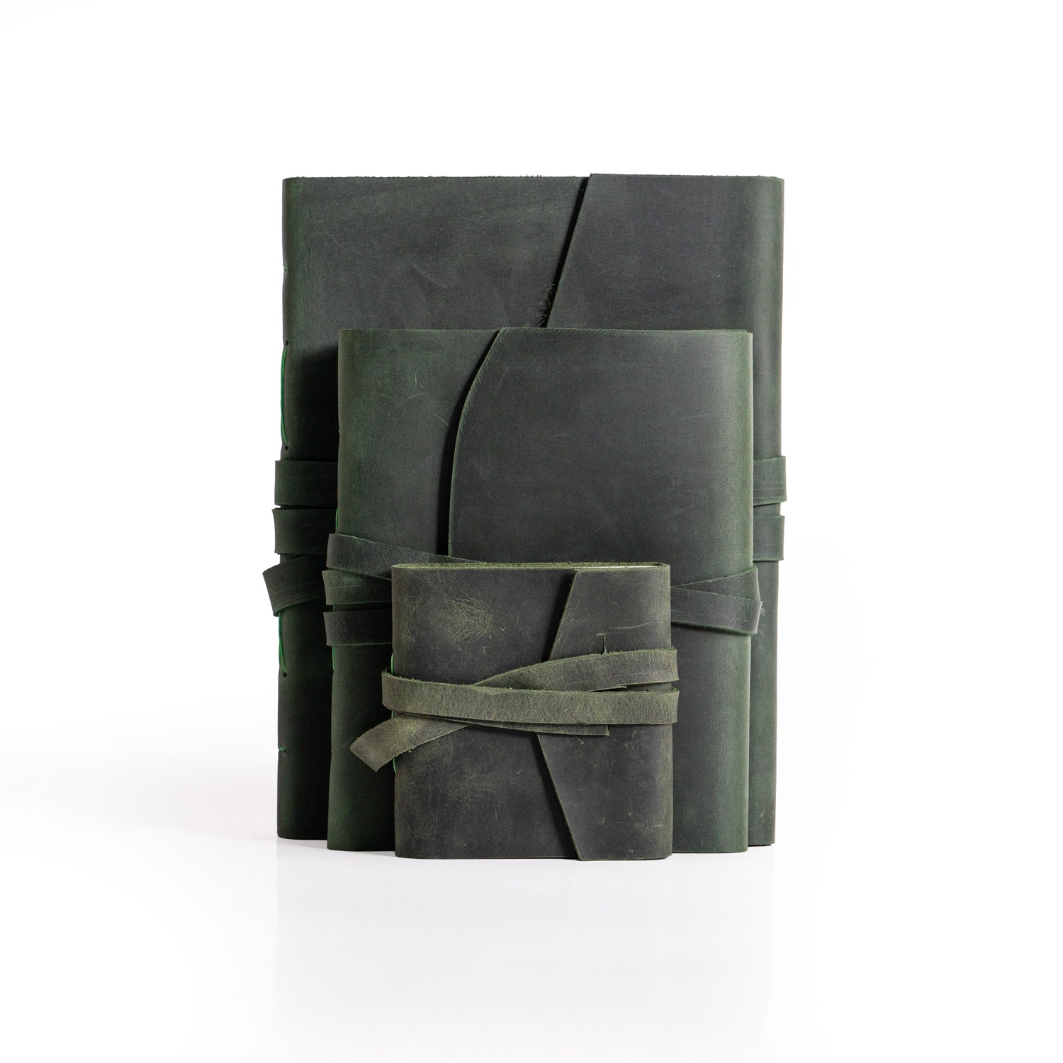 Düşüncelerinizi, hayallerinizi ve anılarınızı bu özel el yapımı yeşil deri defter setiyle ölümsüzleştirin. Her boyut, hayatınızın farklı bir yönünü kaydetmek için tasarlandı.